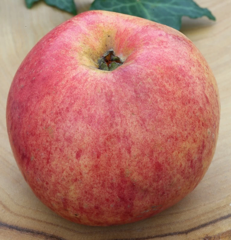 Frucht: Wertvoller Tafelapfel für den Hausgarten. Reift früh (ab Ende August/Anfang September) und hält sich bis Ende Dezember. Breitkugeliger, großer Apfel. Glatte, fettige, gelbe Schale, zur Reife rötliche Streifen. Das Fleisch ist gelblich weiß, sehr saftig. Ausgeprägtes, würziges Aroma. Ist hervorragend zur Weiterverarbeitung geeignet.