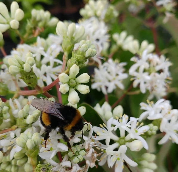Ein absoluter Geheimtipp unter den Ziergehölzen ist diese Besonderheit aus dem fernen Osten. Erst seit kurzer Zeit wird diese Pflanze auch in Europa kultiviert. Das Spezielle ist unter anderem die späte Blütezeit im Herbst, wenn kaum noch andere Pflanzen im Garten zu finden sind, fällt der Sieben-Söhne-des-Himmels-Strauch ganz besonders durch seine üppige Blüte auf. Es handelt sich um einen halb-immergrünen Strauch, der breit und aufrecht wächst. Er wird je nach Standort ca. 2 m hoch. Die Blätter sind dunkelgrün und sehr dekorativ. Ab August erscheinen die weißen, wunderbar duftenden Blüten. Die Blüte reicht bis in den November hinein, im Anschluß entwickeln sich noch rötliche Fruchtdolden (s. Bild). Der Strauch beginnt dann sehr früh mit dem Neuaustrieb. Die Pflanze ist robust und winterhart, sollte aber nach Möglichkeiteinen windgeschützten Standort erhalten.